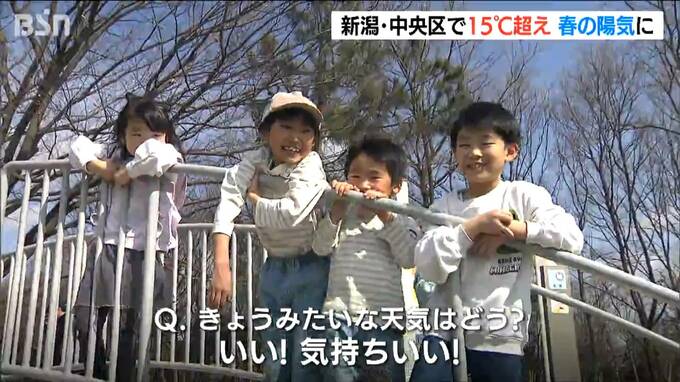高気圧に覆われて青空が広がり、気温が上がった新潟県内。新潟市中央区の公園では上着を脱いで遊ぶ親子連れの姿が見られました。