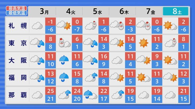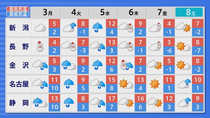 前線が西日本から東日本にのび2日以降は雨脚強まる天気に 東京など関東では4日にかけ雪が降るおそれ 雨・雪と風シミュレーション 北陸放送 2025年3月1日(土) 19:19 国内 2日は西日本を中心に雨が降るでしょう。 4日は東京で雪が降る天気になりそうです。 北陸など日本海側では、1週間を通して雨や雪が降りやすい天気になるでしょう。 週の後半は上空の寒気もやや強く、気温も低くなる見込みです。