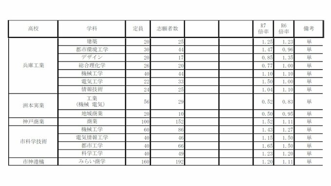 専門学科では、市科学技術(都市工学)で1.65倍、神戸商業(商業)で1.52倍、兵庫工業(電気工学)で1.50倍、兵庫工業(都市環境工学)で1.47倍、市科学技術(機械工学)で1.43倍などでした。