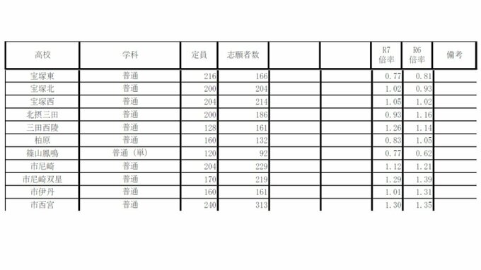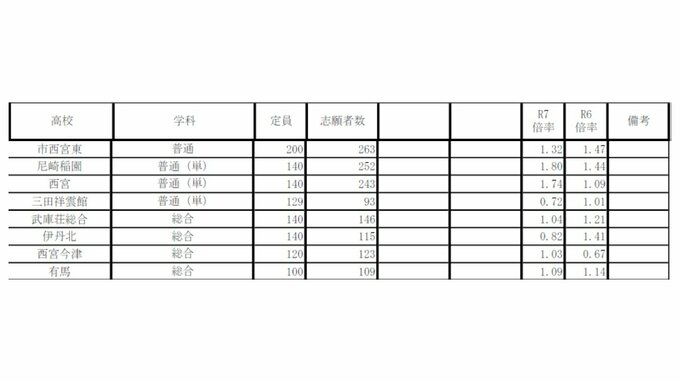 兵庫県公立高校入試2025 志願倍率は神戸1.16倍 長田1.15倍 加古川東1.28倍 市立西宮1.3倍 全日制の倍率一覧【全校掲載】 毎日放送 2025年3月1日(土) 19:38 国内 学校別の倍率 西宮1.74倍 市西宮1.3倍 市尼崎1.12倍