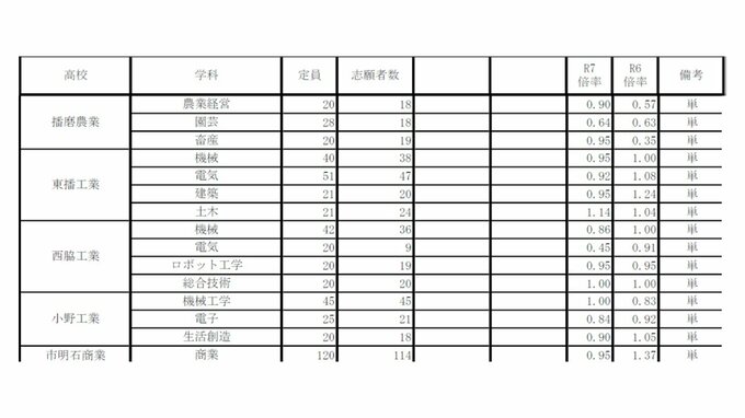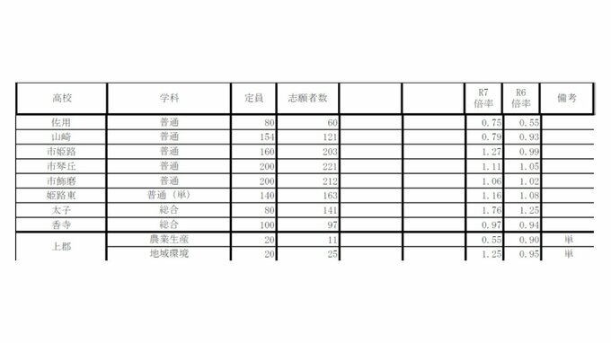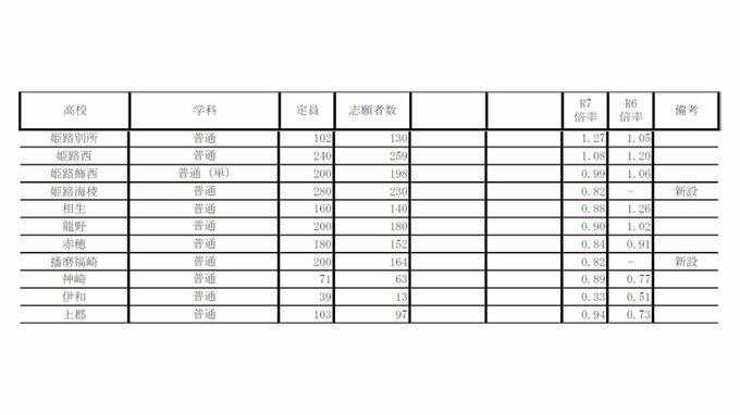 兵庫県公立高校入試2025 志願倍率は神戸1.16倍 長田1.15倍 加古川東1.28倍 市立西宮1.3倍 全日制の倍率一覧【全校掲載】 毎日放送 2025年3月1日(土) 19:38 国内 学校別の倍率一覧 姫路西 1.08倍 姫路別所 1.27倍