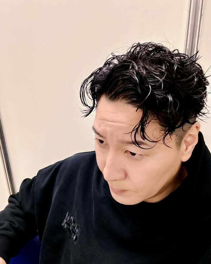 左斜め上の角度からとられた写真ではいつもオールバックが特徴的な長田さんの髪はくるくるになっていて、パーマがかかっていることが伺えます。