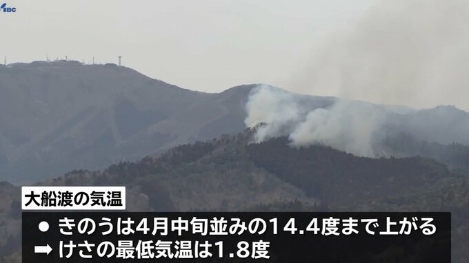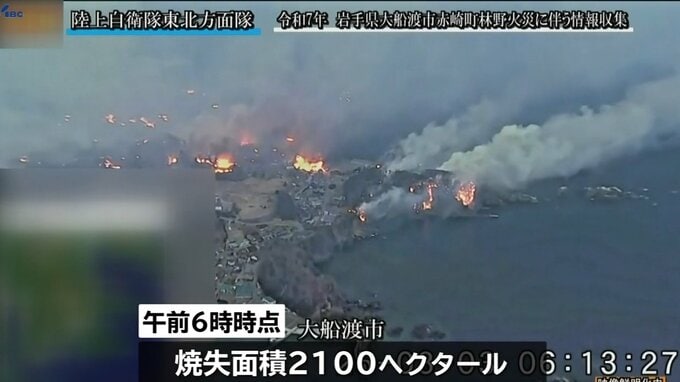 大船渡市の山林火災は発生から6日目を迎え、午前6時時点で2100ヘクタールにまで焼失面積が広がりました。