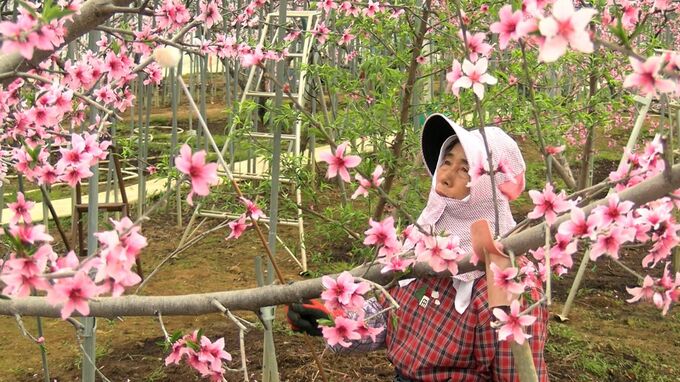岡山県勝央町の農園の温室で育てている桃の花が満開となりました。授粉作業が最盛期を迎えています。