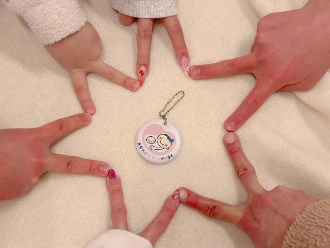 「この度、私たち夫婦のもとに新しい命を授かりました。」と第5子を授かったことを、家族ピースの中にマタニティーマークのキーホルダーを入れた写真と共に報告しました。