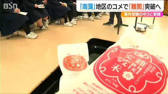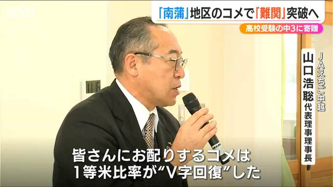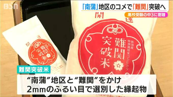 受験の“難関”を乗り越えてもらおうと、新潟県の「南蒲(なんかん)地区」でとれたコメが贈られました。