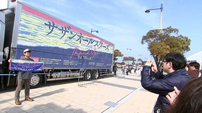 あなぶきアリーナ香川のこけら落とし公演として2日間開かれた、サザンオールスターズのコンサートです。幸運にもチケットがとれたファンだけでなく、グッズを買い求める人や記念写真を撮る人などでにぎわいました。