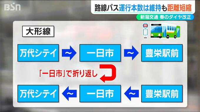 今春の新潟市の路線バスダイヤ改正で例えば、万代シテイ発の大形線で折り返し地点をこれまでの豊栄駅より片道で9.3km手前の一日市にするなど、大形線や松浜線などで運行距離が短縮されます。