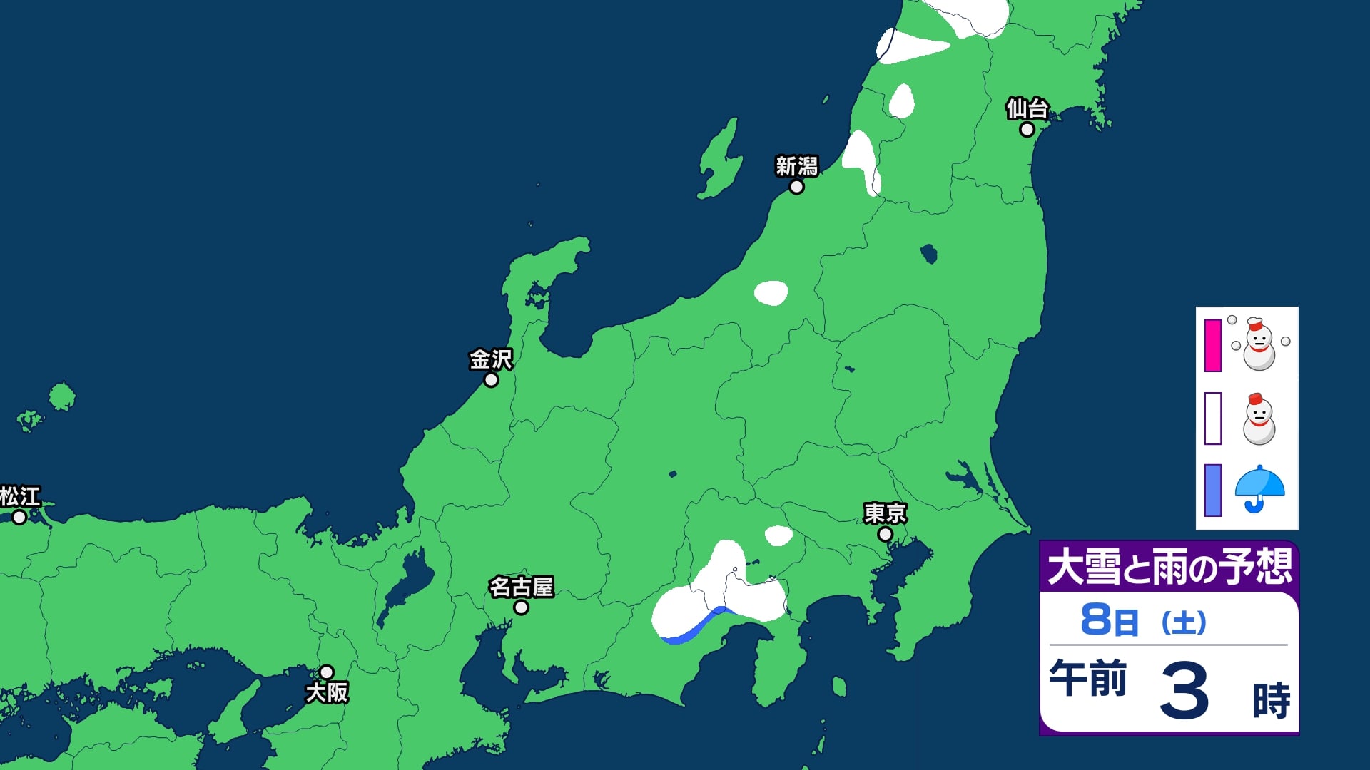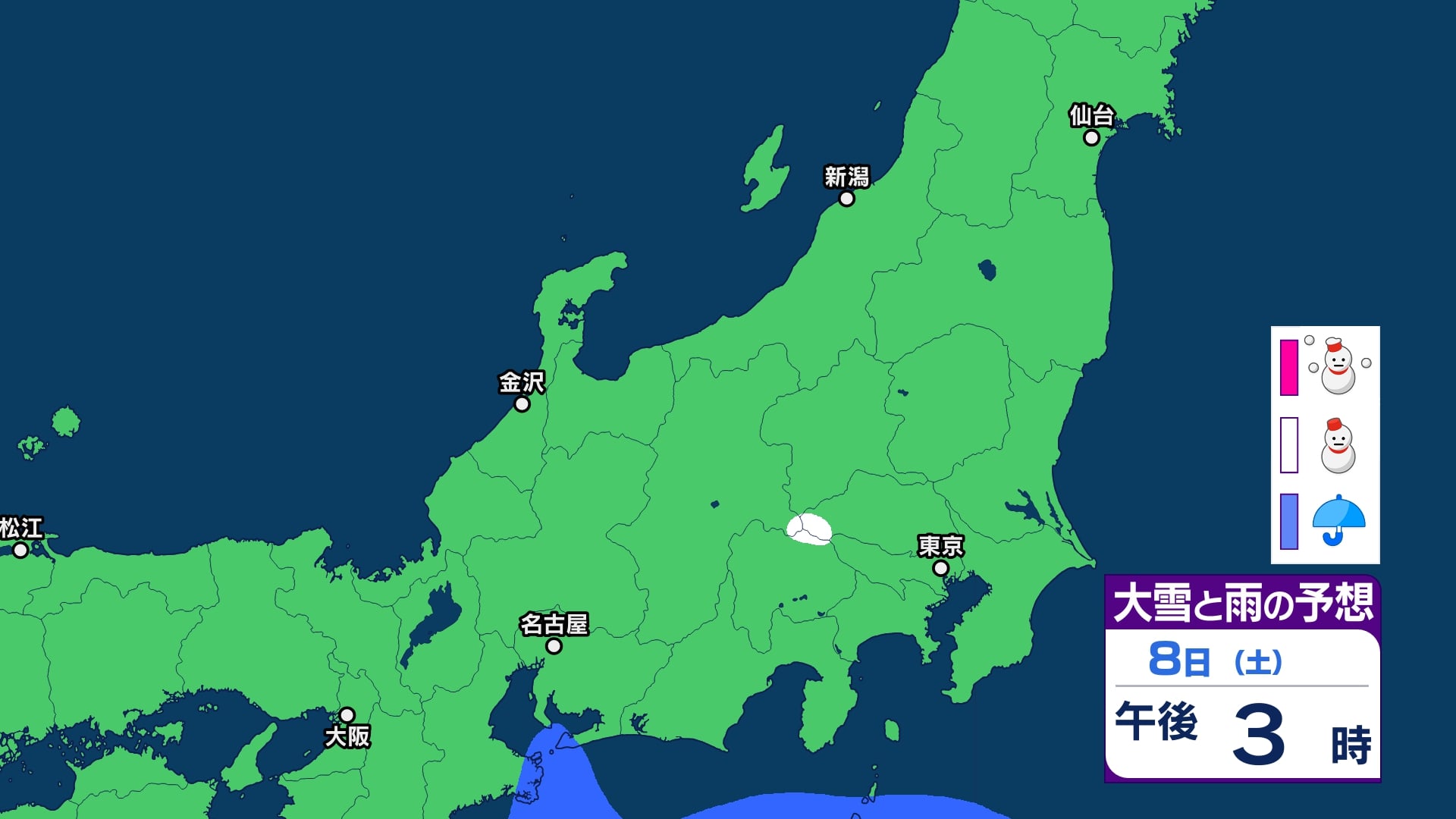 【大雪情報】関東甲信地方は南部の平地でも積雪か 南岸低気圧が4日5日にかけ東海道沖へ 4日夕方まで関東北部1㎝ 箱根から多摩地方や秩父地方にかけて5㎝ 関東南部平地3㎝ 甲信5㎝の降雪予想 積雪や路面凍結による交通障害、着雪やなだれに警戒・注意呼びかけ【雪と雨のシミュレーション】 チューリップテレビ 2025年3月3日(月) 18:55 国内 天気 8日(土)大雪と雨のシミュレーション