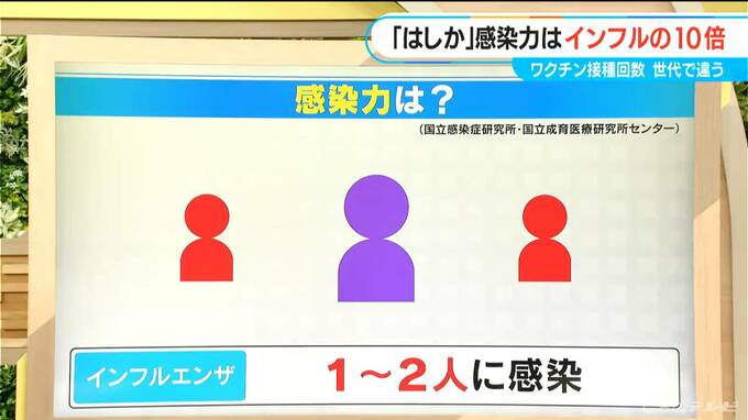 このように「はしか」は、感染力が非常に強いのが特徴です。例えばインフルエンザと比べてみます。インフルエンザの感染者が集団の中に1人いると、周りの1~2人に感染させるぐらいの力なんです。
