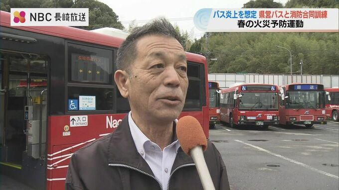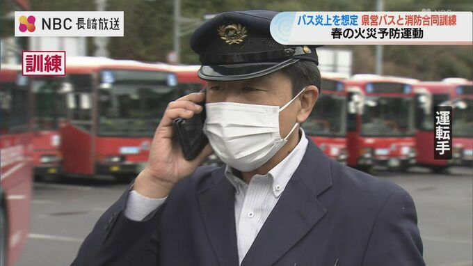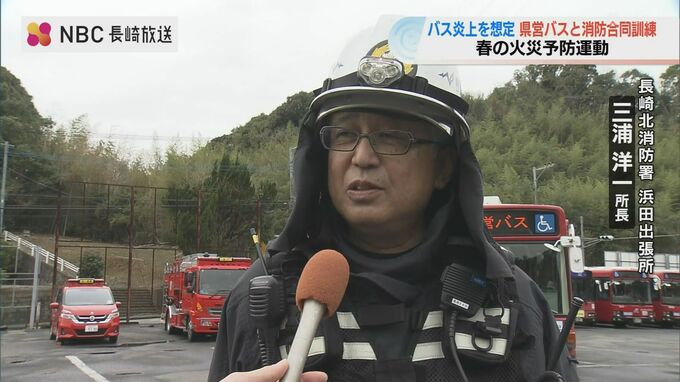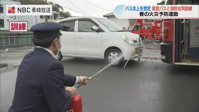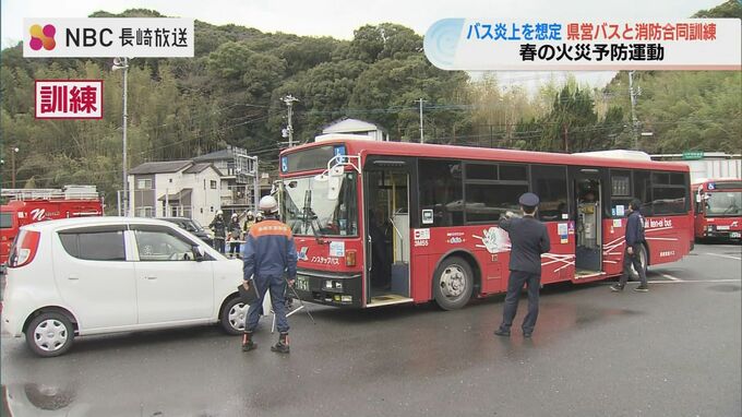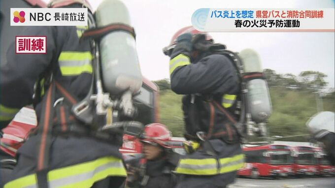 今月1日から始まった「春の火災予防運動」に合わせて3日、長崎県長与町でバス火災を想定した県営バスと消防の合同訓練が行われました。