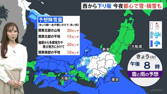 今夜からあすの明け方にかけては、関東甲信の広い範囲で雪や雨となりそうです。東京都心でも、あすの朝にかけて3センチの雪が降る予想で、うっすらと積もる可能性があります。あすの朝には雨と変わっていきますが、路面状況をご確認ください。