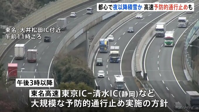 国土交通省などによりますと、午後3時以降、▼東名高速・東京インターから静岡の清水インターまでのおよそ150キロの区間をはじめ、大規模な予防的通行止めを実施する方針だということです。