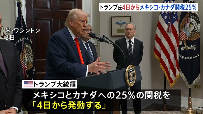 アメリカのトランプ大統領はメキシコとカナダにかける25%の関税について、予定通り4日から開始すると表明しました。アメリカ トランプ大統領「メキシコとカナダに交渉の余地はない。もう決まった。明日(4日)、…