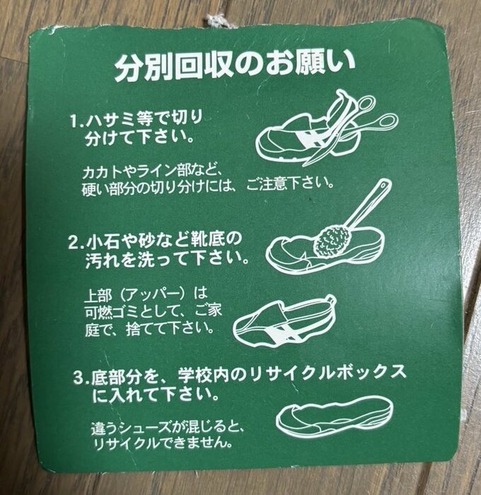 滝沢さんは「上履きも回収ボックスに入れるとリサイクルできるそうです」と、投稿。分別回収の説明画像をアップしました。