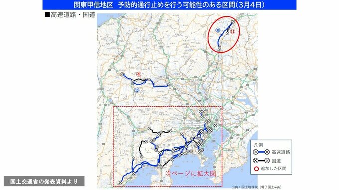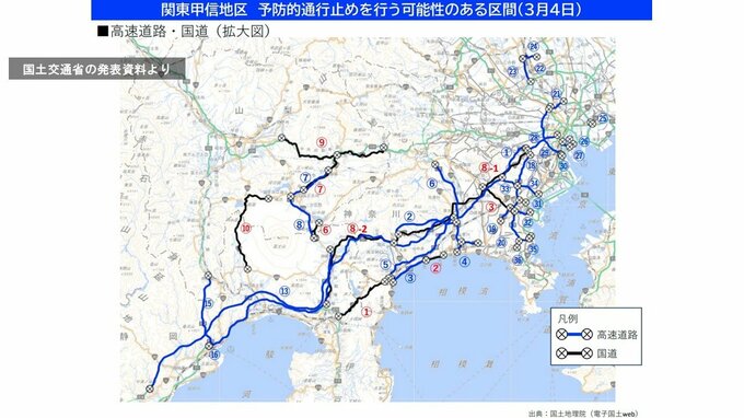 【情報更新】東名、新東名、首都高などで「予防的通行止め」4日午後4時から実施 主な開始見込みはどこ? 高速道路・国道まとめ一覧表あり【いつ?どこで雪は降る?1時間ごとの大雪と雨のシミュレーションあり】 青森テレビ 2025年3月4日(火) 15:53 国内