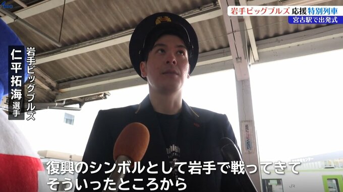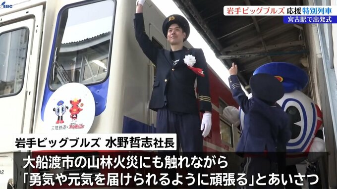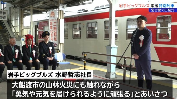 4日、宮古駅で行われた出発式には、岩手ビッグブルズの水野哲志社長と仁平拓海選手が訪れ、水野社長は大船渡市の山林火災にも触れながら「勇気や元気を届けられるように頑張る」とあいさつしました。
