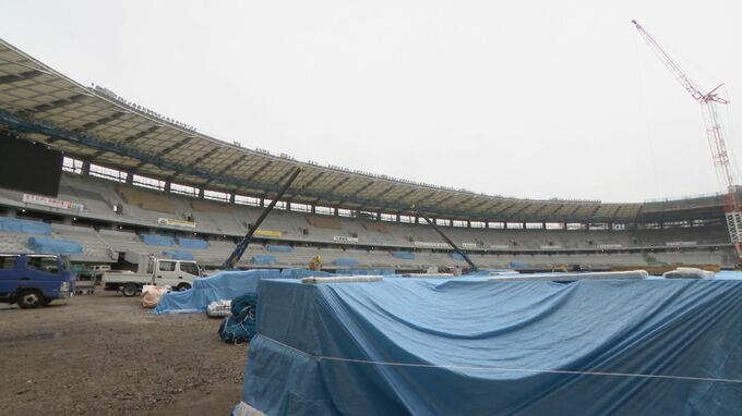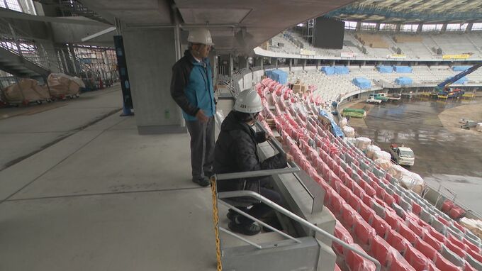 「屋根の工事は今月で終わり、60~70パーセントくらいまで進んでいる。来月からフィールドの工事を着手する予定。周りが(陸上の)トラックで、中には天然芝を」