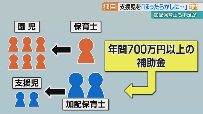 北谷町では支援が必要な園児に対して、安全確保などの観点から加配保育士を個別で配置しています。園では、支援児2人に対してそれぞれ1人ずつ保育士を配置することで、町から年間700万円以上の補助金が支払われることになっていました。