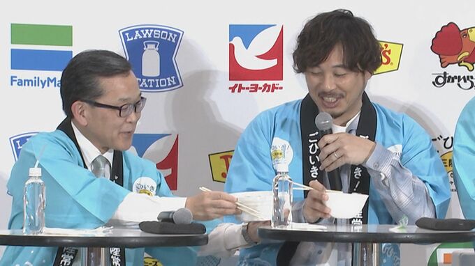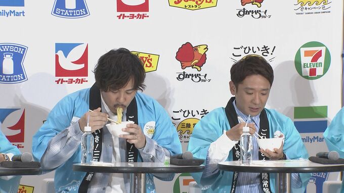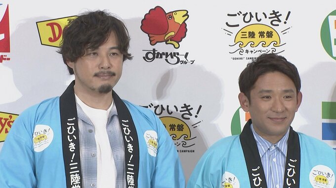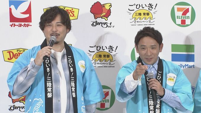 アルコ&ピースの2人は、今年でキャンペーンのアンバサダー3年目。いわき市出身の平子さんは“(地元での)ロケの度に、嫌というほど美味いものを食べている。地元の我々でも知らない美味しいものが増えている“と、三陸常磐の食べ物を絶賛。同じく、いわき市出身の松井さんも“いわき市だと、メヒカリとか。ちっちゃい頃から食べてます”と、地元の魅力を語りました。