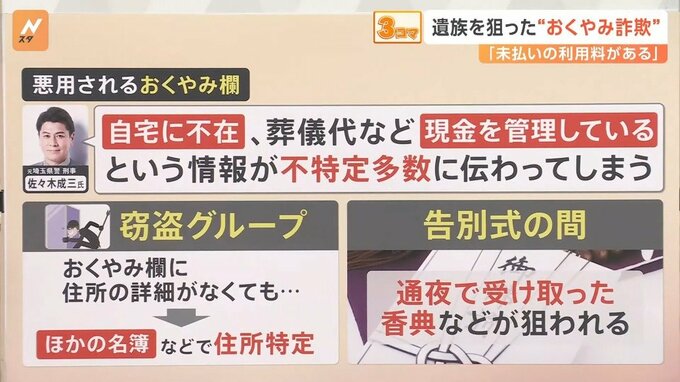 おくやみ欄を窃盗グループが悪用しているということで、元埼玉県警刑事の佐々木成三さんは「自宅に不在、葬儀代など現金を管理しているという情報が不特定多数に伝わってしまう」と話します。