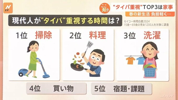 「現代人が“タイパ”重視する時間は?」というアンケート(セイコー時間白書2024、15歳~69歳の男女1200人を対象に調査)では、1位が掃除、2位が料理、3位が洗濯と、やはりトップスリーは家事でした。4位が買い物、5位が宿題・課題と続いています。