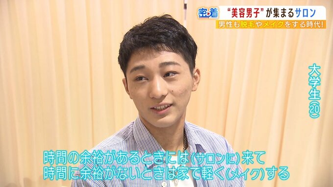 韓国アイドルのように!じわり定着『メンズメイク』サロン密着取材 バレないorバッチリと目的別に...25歳男性もメイクで彼女は「となり歩くのルンルンです」 毎日放送 2022年10月12日(水) 15:07 経済 話題・グルメ 「週に1~2回」すっかりリピーターになった大学生 別の日、サロンには見覚えのある男性の姿が。先日メンズメイクに初挑戦していた大学生です。 (大学生)「今日は前回と同じように清潔感でいこうかなと思っています」 あれからメンズメイクの虜になっていたようです。すっかりリピーターになっていました。 (大学生)「(来店は)週に1~2回ですね。時間の余裕があるときには来ていて、時間に余裕がないときは家で軽くする感じで」 肌の手入れから一歩踏み出したメンズメイク。新たなトレンドとして定着しつつあるようです。