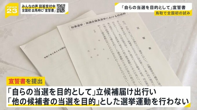 鳥取県では、立候補を届け出る際に、県の選管が「自らの当選を目的として」立候補の届出を行い、「ほかの候補者の当選を目的」とした選挙運動を行わないなどを約束させる『宣誓書の提出』を求めることを決めました。