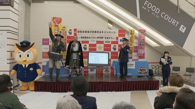 訓練の後には名古屋おもてなし武将隊によるトークショーが行われ、買い物客に特殊詐欺などへの注意を呼びかけました。