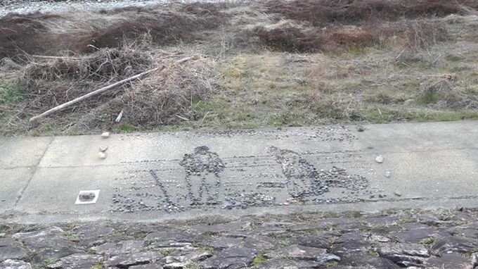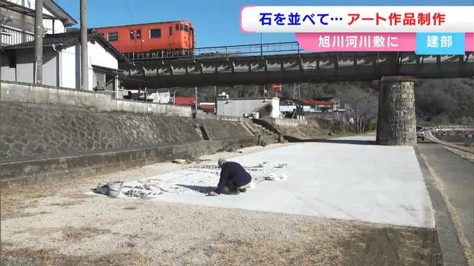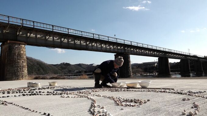 【画像⑩】のように、JR津山線が走る鉄橋のすぐそばで描かれる三宅さんの作品。もしかしたら列車の中からも見えるかも知れません。三宅さんは岡山市北区の「たけべ八幡温泉」近くの河川敷で、今日も石を並べています。