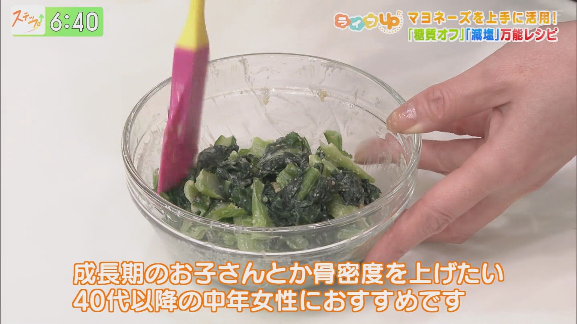 --武田都さん(野菜ソムリエ)「小松菜に含まれているβカロテン・カルシウム・鉄分は油と一緒にとると吸収率がぐんと上がります。だから成長期のお子さんとか、骨密度を上げたい40代以降の中年女性におすすめです。」