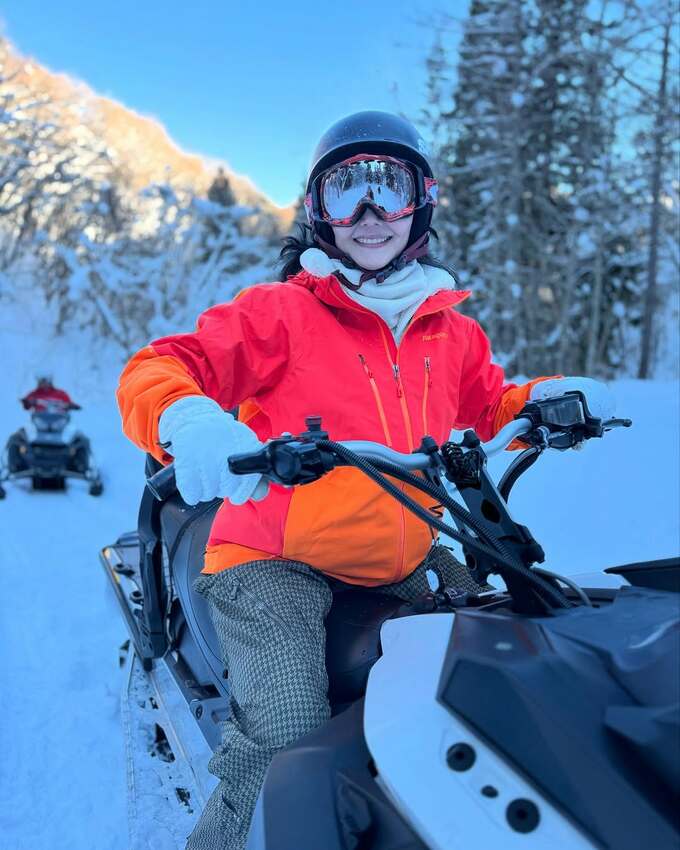 続けて、「ここのスキー場でおすすめなのが #スノーモービル です」と綴り、「予約してレクチャーを受けてからは、それぞれがスノーモービルに乗って雪原散歩に出ます。白銀の森をスノーモービルで滑るのは最高の体験でした。インストラクターさんもとても親切で丁寧。これまた絶対やりたい」と、スノーモービルにまたがって操縦している写真や、笑顔満載の動画を投稿し、満喫した様子を記しました。
