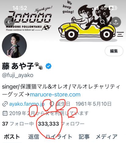 歌手の藤あや子さんが自身のXアカウントの ”フォロニャー” =フォロワーが333,333人(ミャーミャーミャーミャーミャーミャー)を達成したことを報告しました。