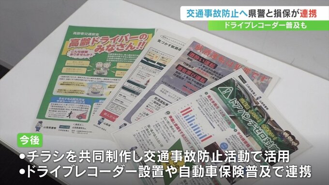 両者は共同でチラシをつくり街頭活動や交通安全教室で事故の防止を呼びかけるほか、ドライブレコーダー設置や自動車保険の普及活動でも相互に連携することになっています。
