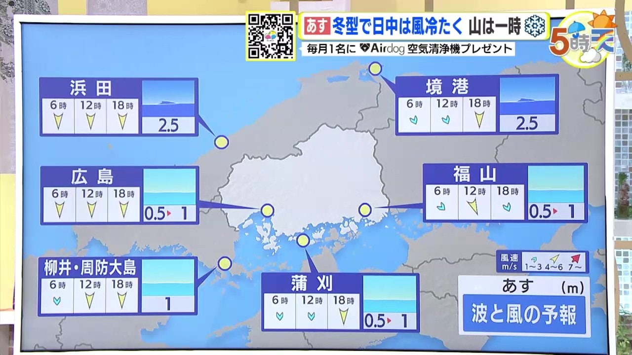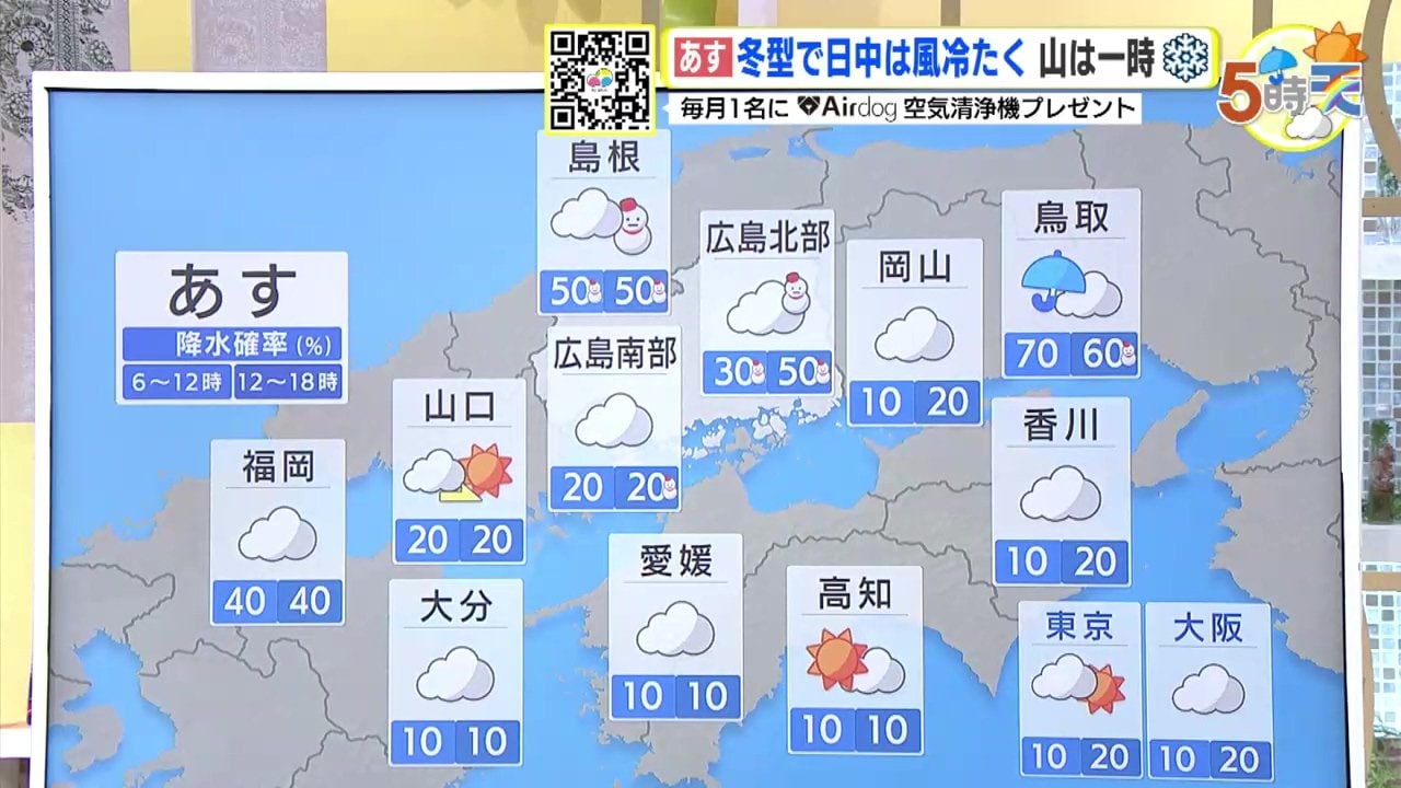 6日(木)冬型の気圧配置であすも曇り空 寒気の影響で北部ほどしぐれ模様 沿岸部はにわか雨の可能性も