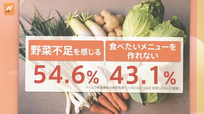 野菜の価格高騰が続く中で、くふう生活者総合研究所が全国5250人に調査したところ、「野菜不足を感じる」という回答は54.6%、さらには「食べたいメニューを作れない」という回答は43.1%だったそうです。