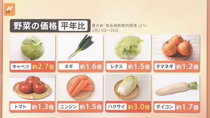 キャベツは約2.7倍、ハクサイは約3.0倍などとなっていて、農水省は3月いっぱいは平年より高値が続く見込みだとしています。