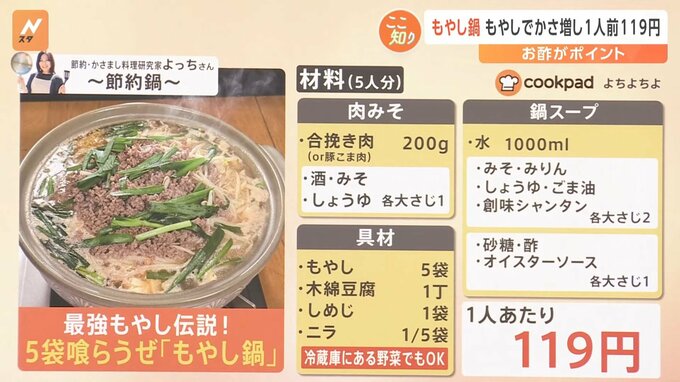 酢を入れることで、すっきりとした味わいになります。これで1人あたり119円です。