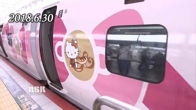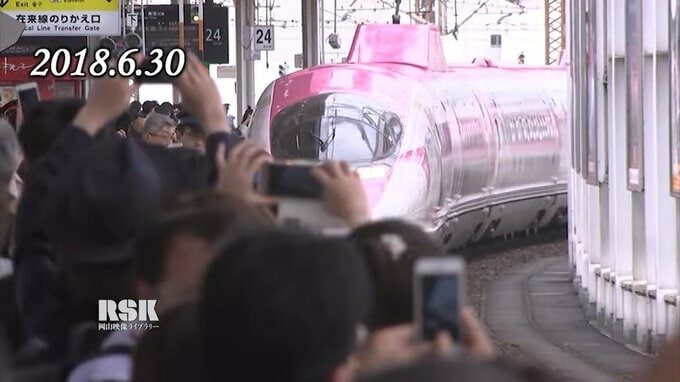 それが「ハローキティ新幹線」です。あのシャープなたたずまいの500系が2018年6月30日、「ピンク色」になって岡山駅に入線してきました【画像⑬】。