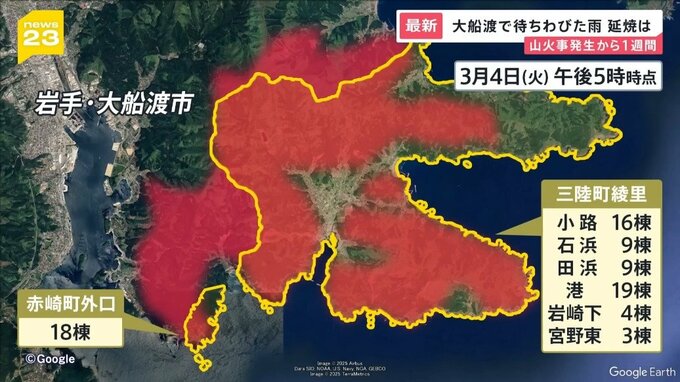 5日で発生から1週間が経った岩手県大船渡市の山火事。これまでに市の面積の9%にあたるおよそ2900ヘクタールが焼けました。また、住宅など建物への被害が三陸町綾里や赤崎町外口で少なくとも78棟で確認されたということです。