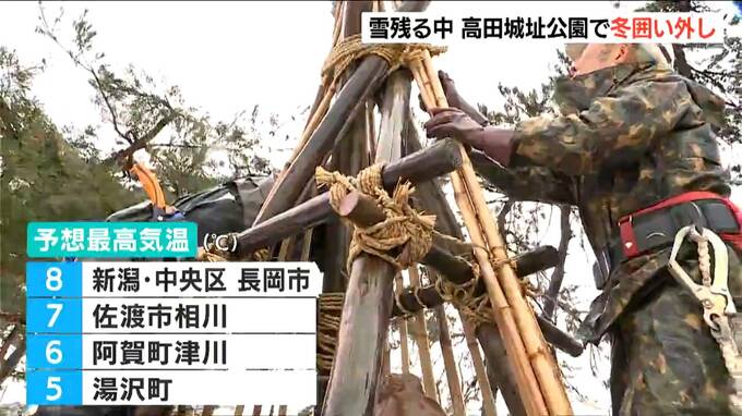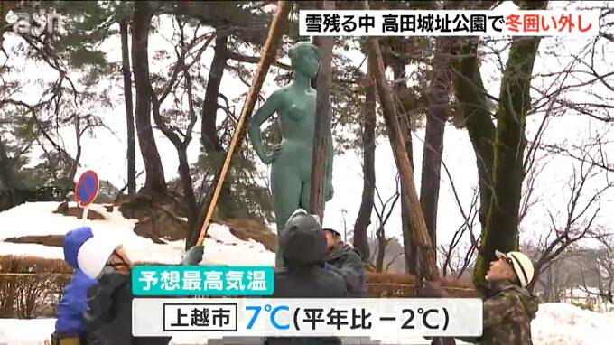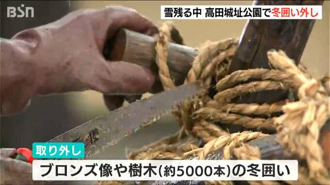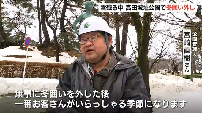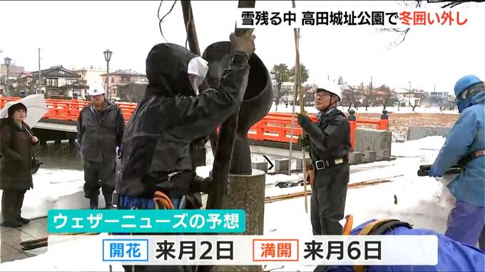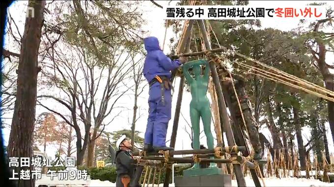 新潟県 上越市の高田城址公園では雪が残る中、春を迎える冬囲いの取り外しが始まりました。