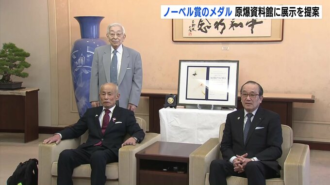 ノーベル平和賞を受賞した日本被団協の箕牧智之代表委員が5日、広島市の松井市長に、メダルと賞状のレプリカを原爆資料館に展示したいと提案しました。また、現在、開かれている核兵器禁止条約の締約国会議について望みを託しました。