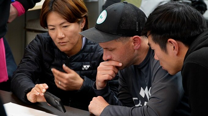 選考メニューは、基礎練習に始まり、ダブルス・シングスといった試合形式での練習が続く。ダブルスの試合が最も力量を測りやすいとコーチ陣は語る。試合はメンバーを入れ替えながら、各プレーヤーの特徴を細部まで見極めていた。ダニエル、藤原の両コーチに加え、西村尚也コーチ(34)もアシスタントに加わり、選手ひとりひとりのチェックに割く時間も増えた。時折、コーチたちが選手に声をかけながら、人柄や競技にかける想いなどを聞いている姿も多く見られた。