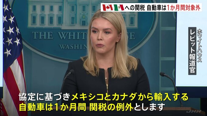 アメリカのトランプ政権は、4日に発動したカナダとメキシコへの25%の関税をめぐり、自動車については1か月間、課税の対象外とすることを決めました。ホワイトハウス レビット報道官「自動車大手3社と話しました。…