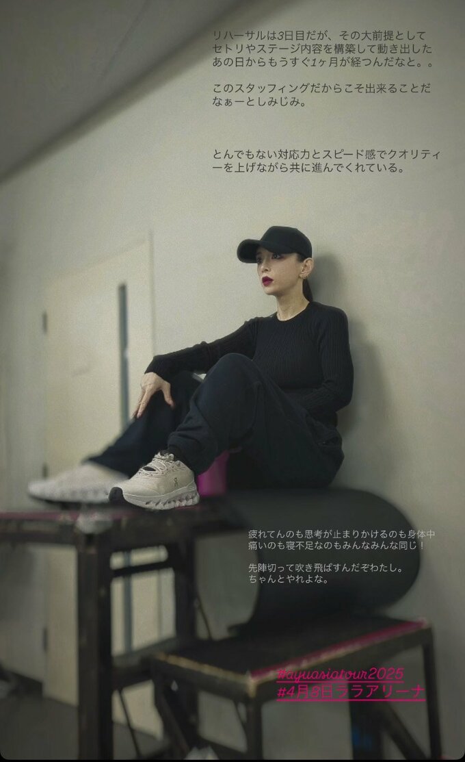 浜崎さんは、上下黒の服と黒い帽子をかぶった姿の写真を公開し、「リハーサルは3日目だが、その大前提としてセトリやステージ内容を構築して動き出したあの日からもうすぐ1ヶ月が経つんだなと。。」と投稿。