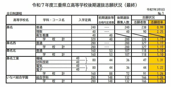 3. 【確定版】三重県立高校入試2025 後期選抜の志願倍率・出願状況 桑名の理数2.25倍、四日市の国際科学2.29倍、津の普通1.12倍、伊勢の国際科学1.83倍