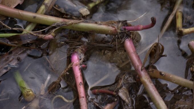 緑色の茎に赤色の根元。岡山県倉敷市真備地区の小田川の河川敷9カ所で、専門家の間で「地球上で最悪の侵略的植物」と呼ばれている水草が見つかりました。