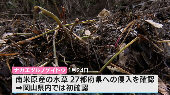 ナガエツルノゲイトウ。南米原産の水草で、これまでに27都府県への侵入が確認されています。岡山県内で発見されたのは、今回が初めてのこと。その経緯は分かっていません。冬場は目立たず、他の植物と見分けがつきにくいといいますが…。