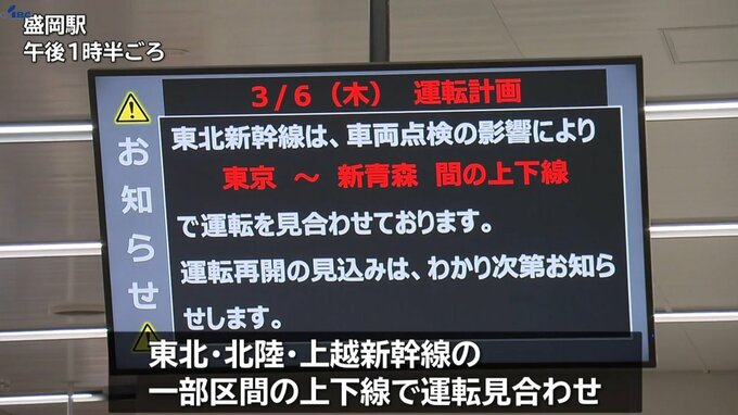 東京~新青森間も運転見合わせとなった影響で、盛岡駅も案内板を確認する人や窓口に行列を作る人で混雑しました。