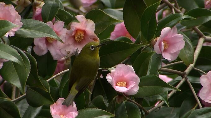 岡山県和気町の和気神社に約120本植えられている椿・「太郎冠者(たろうかじゃ)」が見ごろを迎えています。ピンクの花びらが特徴的な色鮮やかな椿。見ごろを迎えた、「太郎冠者」と呼ばれる品種です。(和泉砂絵…